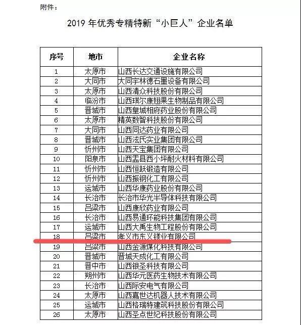 为激励、表扬先进,,,,,,,典范树模引领,,,,,,,增进专精特新中小企业立异创立、高质量生长,,,,,,,凭证《山西省小企业生长增进局关于评选优异专精特新“小巨人”企业的通知》(晋企发[2018]29号)要求,,,,,,,省局组织开展了2019年优异专精特新“小巨人”企业评选事情。。。。。。。。在企业自愿申报,,,,,,,各市中小企业主管部分择优推荐,,,,,,,组织专家评审,,,,,,,面向社会公示的基础上,,,,,,,认定山西长达交通设施有限公司等26家企业为2019年优异专精特新“小巨人”企业。。。。。。。。(名单见附件)
